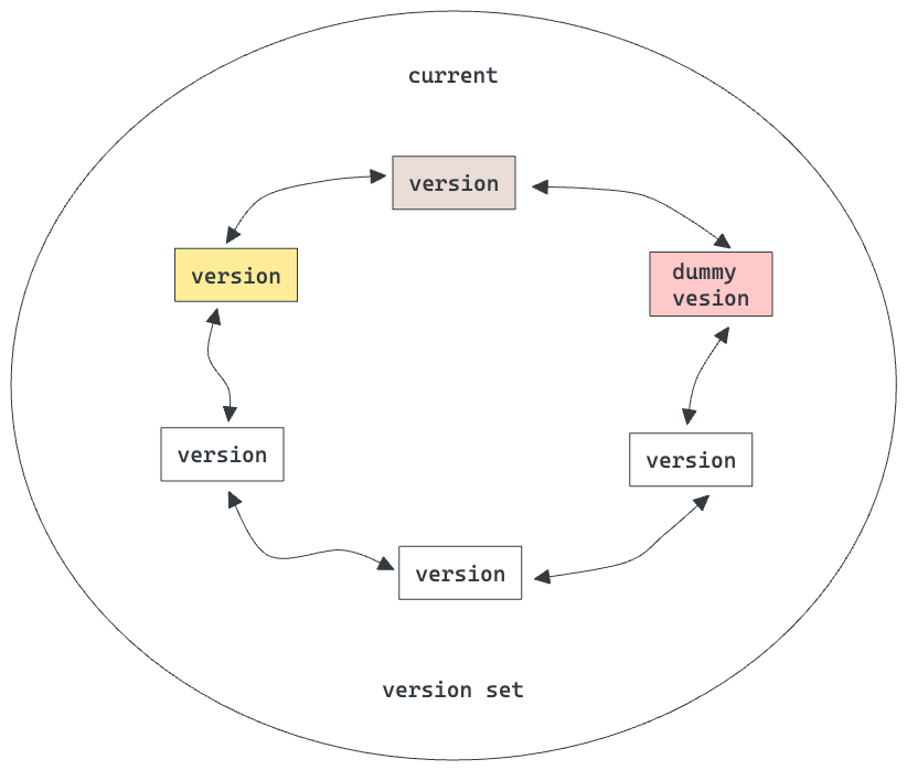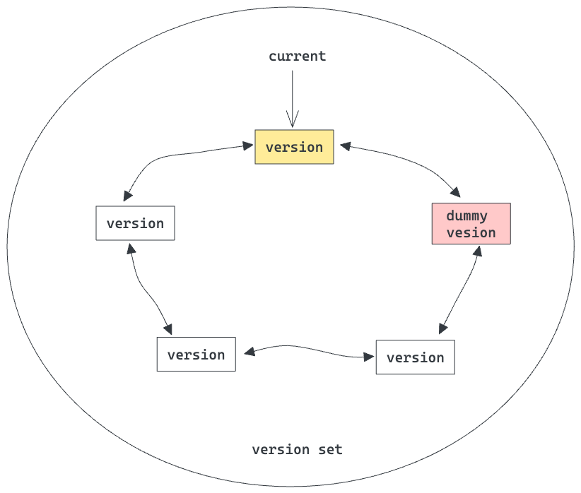 一个正经的DB,肯定少不了并发控制。LevelDB采用的是MVCC机制来实现快照读。本节我们简述LevelDB中的MVCC机制原理。 考虑到磁盘上的SSTables是不可变的,理论上读取的时候不需要任何的并发保护措施,只需要保证当某个SSTable被至少一个客户端在读取的时候,该文件不被删除(考虑删除时机?compaction)即可,这一点采用引用计数即可实现。而内存中的memtable采用和一个mutex保护临界区即可,并采用sequence number来实现快照读。 基于这样的思路,LevelDB将磁盘中的SSTable的某个状态保存在一个version对象中, 当系统中存在多个version时,将这些version串成和一个双向链表,构成和一个version set,如下图所示: